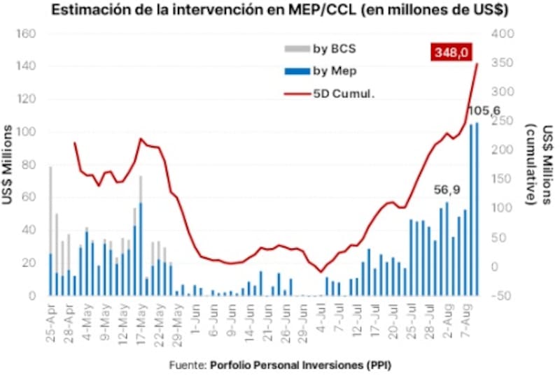 Se estima que ayer el BCRA se desprendió de u$s 105,6 millones para contener los dólares financieros y se observa una notoria aceleración en el ritmo de la intervención en la última semana previa a las PASO.