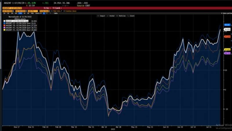 En el tramo medio, los Globales a 2035 y 2038 registran subas de 2,54% y 2%, mientras que la deuda de mayor plazo avanza 2,35% para el Global 2041 y de 2,55% para el bono a 2046.