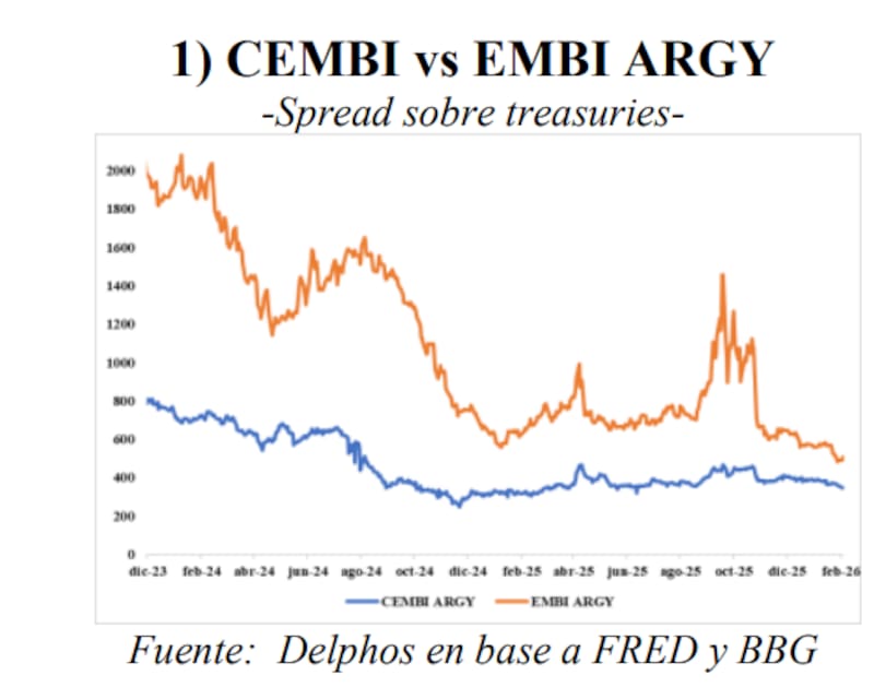 En ese contexto, un informe reciente de Delphos Investment pone el foco en que mientras el Emerging Markets Bond Index (EMBI) soberano argentino comprimió con fuerza, el Corporate Emerging Markets Bond Index (CEMBI) quedó rezagado, lo que abre una oportunidad de trade a favor de los bonos corporativos argentinos (Obligaciones Negociables) del tramo medio y largo.