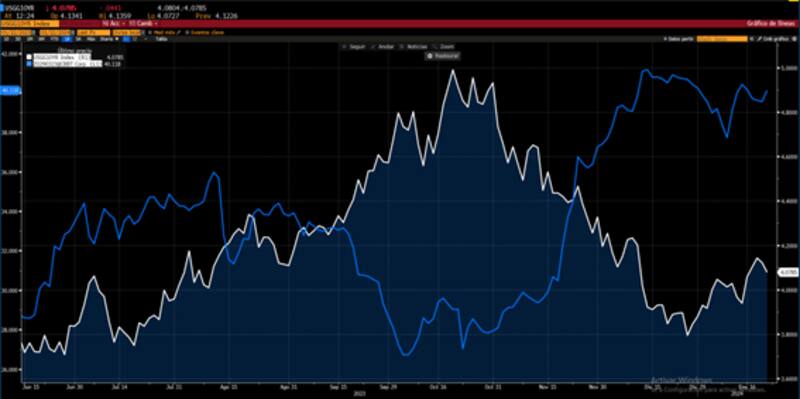 En las últimas jornadas, los inversores han recalibrado sus expectativas sobre las chances de que la Fed podría demorar hasta mayo en comenzar a bajar la tasa de interés, por lo que las tasas de los bonos del tesoro de EEUU se desplazaron al alza.