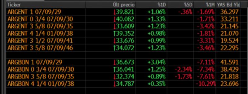 Por su parte, los Globales a 2035 y 2038 ganan 1,23% y 0,98% respectivamente, mientras que los bonos más largos avanzan 0,99% y 1,12% en los títulos a 2041 y 2046.