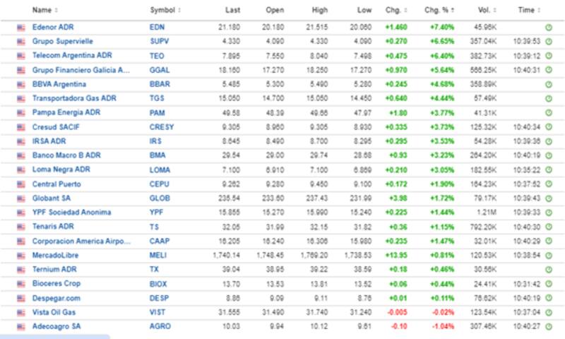 Luego se encuentran acciones como Grupo Financiero Galicia, BBVA Argentina, TGS, Pampa, Cresud, IRSA, Banco Macro y Loma Negra, con ganancias de entre 3& y 5,6%.