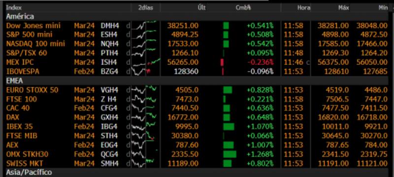 Las acciones en Wall Street también operan al alza. El Dow Jones sube 0,54%, mientras que el S&P500 avanza 0,5%.
