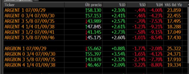 El tramo más corto es el que menos sufrió, con mermas de entre 6% y 6,1%. En el tramo medio, los Globales a 2035 y 2038 retroceden 9% y 10%, al igual que los bonos a 2041 y 2046 que bajan 11% y 9,5% los bonos a 2041 y 2046 respectivamente.