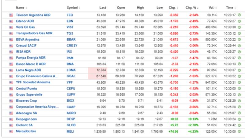 Las mayores bajas se dan en Telecom, Edenor y Vista, que bajan más de 3% cada una.