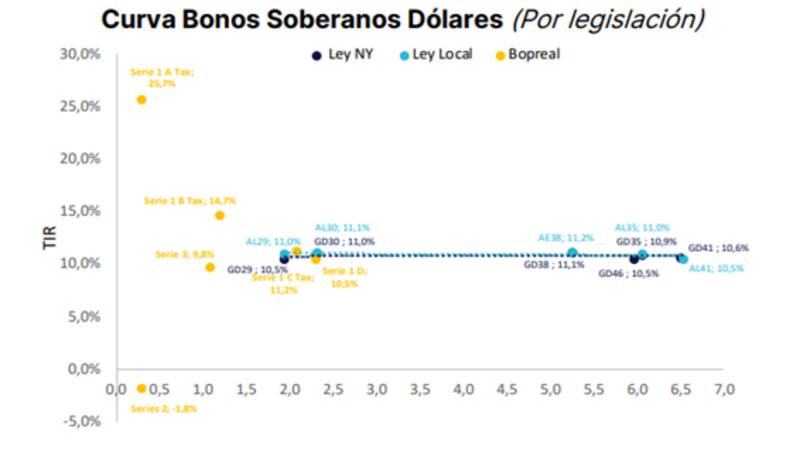 Luego, los bonos más largos rinden por encima de este título, con tasas que saltan al 10,2% en 2030, al 10,45% en el GD35 y 10,63% en el GD38.