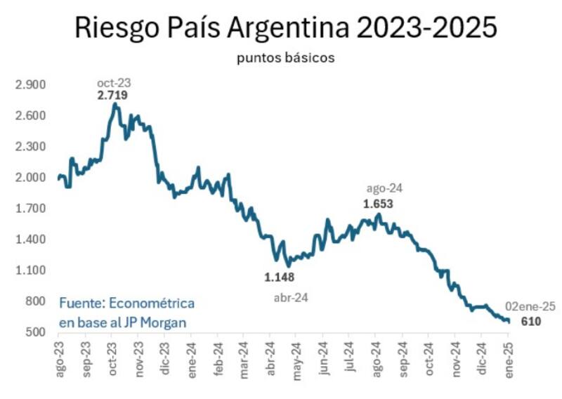 El riesgo país alcanzó nuevos mínimos desde 2018. Se ubica en 610 puntos, acercándose al promedio de Latinoamérica de 432 puntos.