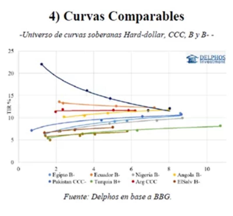 Cuando uno compara la curva soberana argentina contra la de otros países, queda en evidencia que los bonos soberanos locales operan con tasas y rendimientos mas altos.