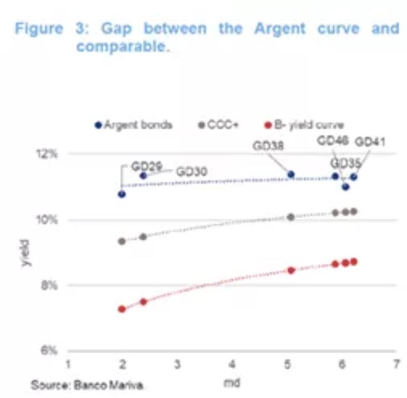 La Argentina opera con tasas más altas respectio a sus pares, pudiendo especular con una compresión en los rendimientos hacia las tasas de países con mejor calidad crediticia, implicando subas en los bonos.