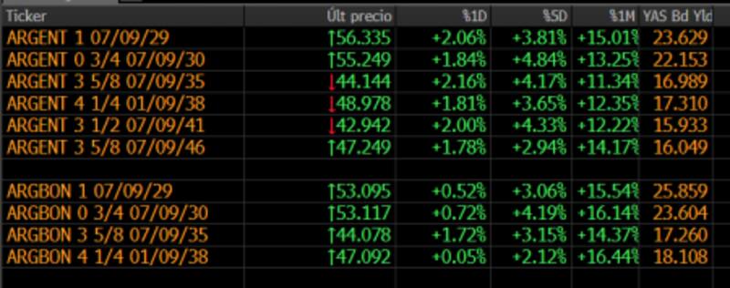 En el acumulado de la semana, los bonos registran subas de entre 3,3% y 4,4%, mientras que en el último mes, la deuda local opera con un avance de entre 11% y hasta 15%.