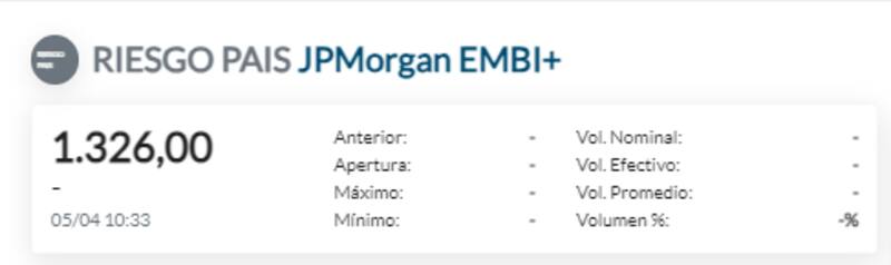 Con la mejora en los bonos, el riesgo país siguió apuntando a la baja y se ubica en 1326 puntos, el menos nivel en cuatro años.