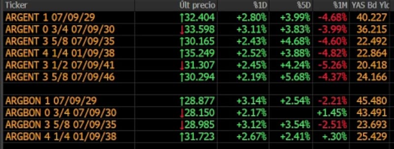 En el tramo medio, los globales a 2035 y 2038 registran ganancias de 2,4% y 2,5%, respectivamente, mientras que en el caso de los bonos a 2041 y 2046, las subas son de 2,4% y 2,1%.