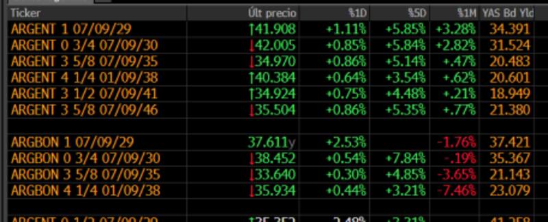 Todos los tramos de la curva argentina operan al alza y buscan cerrar la semana con ganancias.