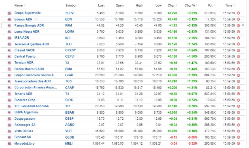Del lado bajista, MercadoLibre y Glovant bajan 0,3% y 0,08% respectivamente.
