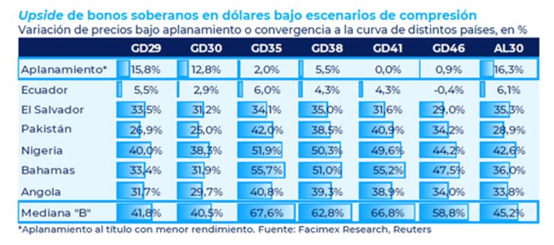 Según sus cálculos, el potencial alcista de los bonos ante una convergencia a créditos "B" es de 41% en promedio en el tramo corto y de entre 45% y hasta 68% en los tramos medios y largos. El de mayor potencial alcista actualmente es el GD35.