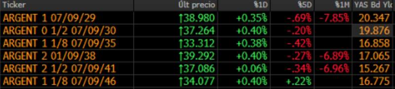 Se destacó una suba del 0,4% en el caso del GD30, cuya tasa de retorno se colocó en 19,9 por ciento.