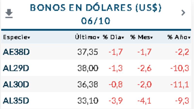 Entre los ley local, al mirar la planilla de ByMA se ven todos retrocesos. El AL35D cerró con una baja del 3,9%, mientras que el AL30D cedió un 0,8 por ciento.