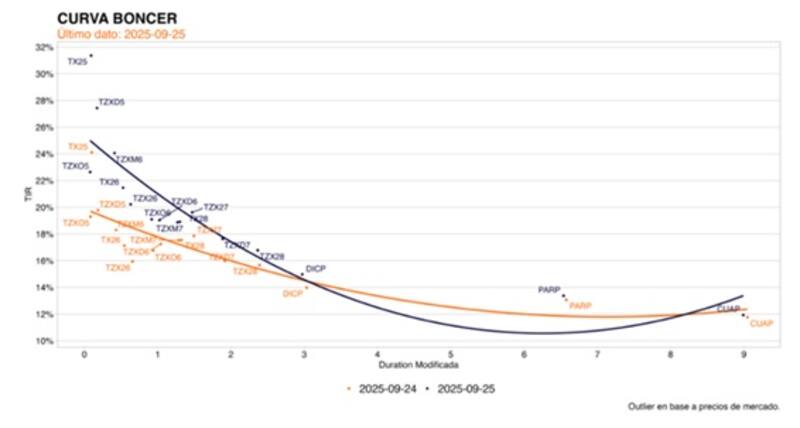 Tras la fuerte suba de los bonos, la curva comprimió significativamente de tasa y hoy la curva rinde en niveles de 28% en el tramo más corto, cayendo a niveles de 24% a 20% en el tramo medio y a 15% en el tramo más largo.