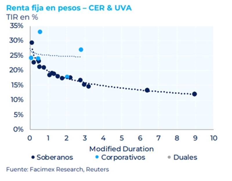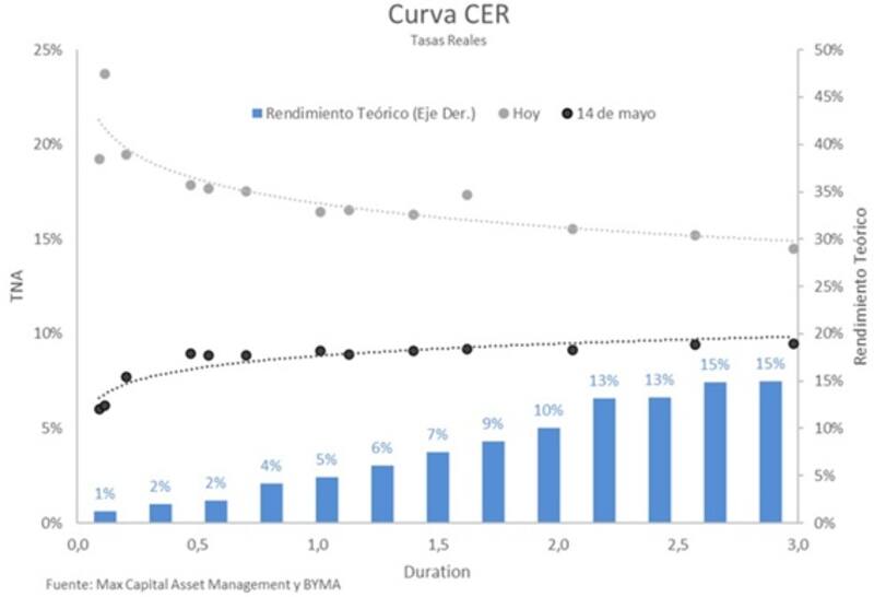 A comienzo de esta semana, los bonos que ajustan por CER operaban con tasas de 34% de tasa real en el tramo más corto, cayendo a niveles de 28% en el tramo corto y de 20% a 18% en los tramos más largos.