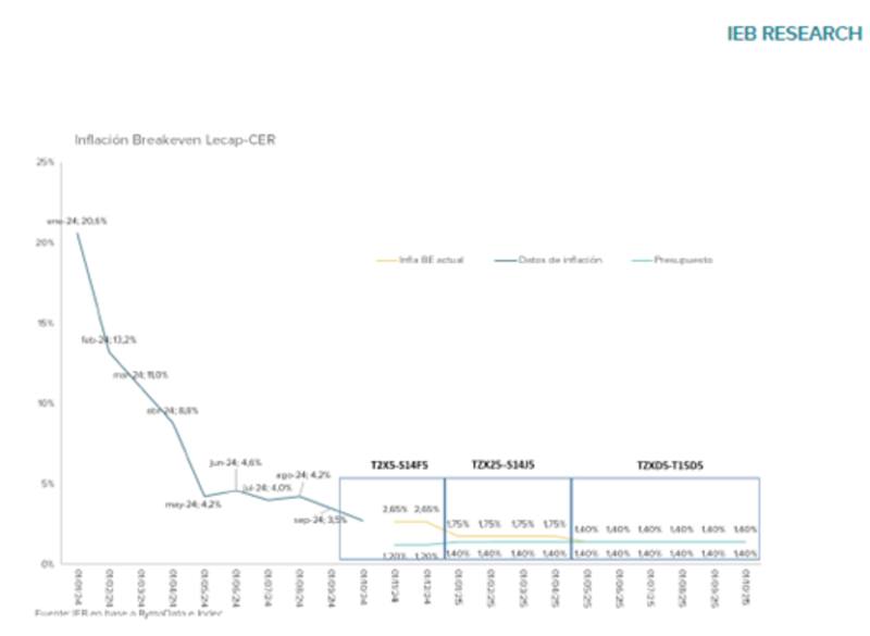 "Para posiciones de baja duration, priorizamos CER antes que Lecaps ante breakevens de inflación que lucen algo bajos. La inflación breakeven entre CER y Lecaps se ubica en 2,4% mensual para el trimestre noviembre-enero y en 1,5% mensual para el trimestre febrero-abril. Son cifras que lucen algo bajas en relación a nuestro escenario base, incluso si el Gobierno baja el crawling al 1% mensual, motivo que nos lleva a sobreponderar CER sobre Lecaps", indicó.