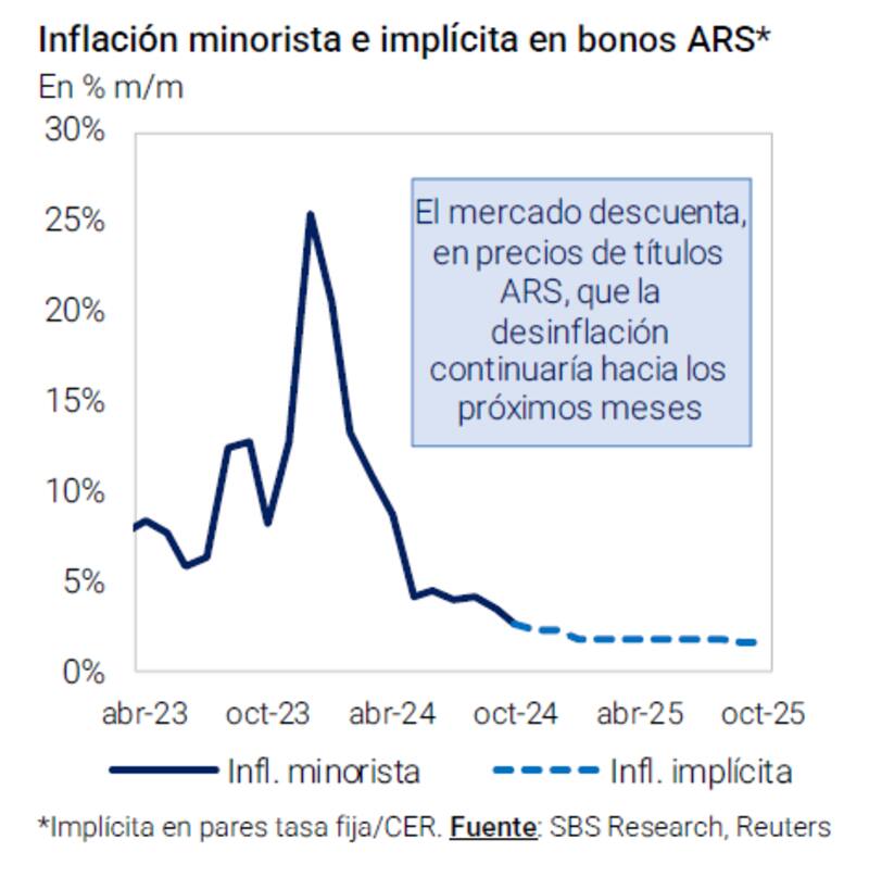"Los precios de mercado tienen implícito una inflación de 2,2% para el último bimestre de 2024, algo por debajo de nuestras estimaciones de 2,6%. Algo similar ocurre a plazos más largos: la inflación breakeven es de 21% interanual para 2025, en tanto que nosotros esperamos una variación más cercana al 30% interanual", afirmó.