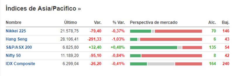 El índice Nikkei de los 225 principales valores cedió 0,19% (-41,35 puntos) y cerró la sesión a 21.616,80 puntos.
