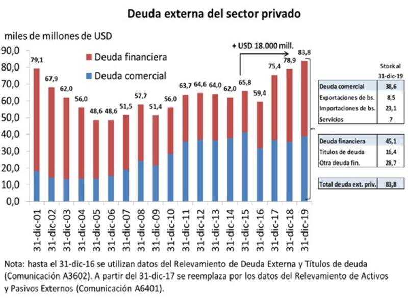 Entre diciembre de 2015 y diciembre de 2019 la deuda externa privada creció en u$s 18.000 millones hasta alcanzar u$s 83.800 millones, un nivel superior al de 2001. Del total, u$s 38.600 millones correspondían a deuda comercial y u$s 45.100 millones a deuda financiera.