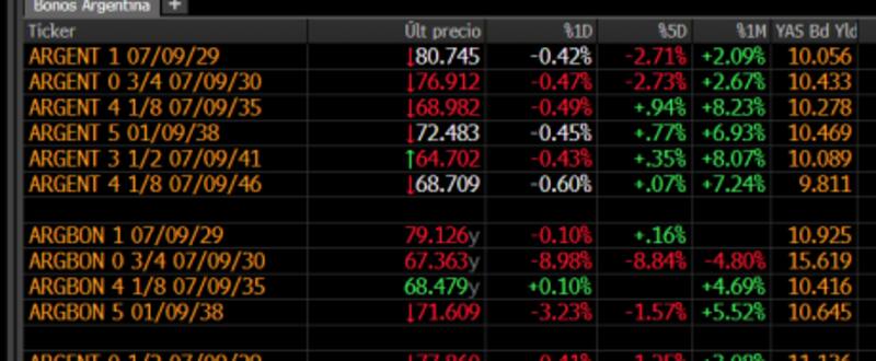 En el tramo medio, las mermas son de 0,49% en el GD35 y de 0,45% en el GD38 mientras que los bonos más largos caen entre 0,43% y 0,6% en los vencimientos a 2041 y 2046.