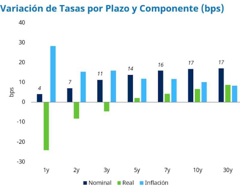 "Tras conocerse el dato, las tasas suben entre 5 y 10 bps, acumulando subas de casi 20 bps en la semana, explicado principalmente por el componente inflacionario de la tasa. El mercado empieza a ponderar que el próximo recorte de tasa por parte de la FED podría llegar en junio. Incluso más, hoy pone en precios sólo 2 bajas de tasas (50 bps) para los próximos 24 meses vs un Dot Plot que marcaba 4 bajas (100 bps)", indicó Lekovic.