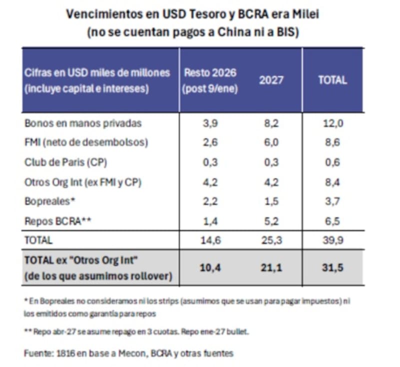“En 2027 hay elecciones y, a juzgar por la historia, es posible que el año que viene los inversores sean más cautelosos. Entre el BCRA y el Tesoro el sector público nacional consolidado enfrenta compromisos en moneda extranjera con privados, FMI y Club de París por u$s 10.400 millones en lo que resta de 2026 y u#s 21.100 millones en 2027”, indicaron.