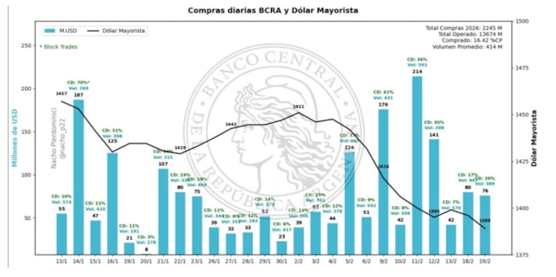 Hasta ahora, el BCRA compró en febrero unos u$s 1088 millones y, en lo que va del año acumuló u$s 2245 millones.