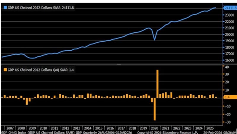 El PBI de EEUU ajustado a la inflación aumentó un 1,4 % anualizado en el cuarto trimestre, tras haber aumentado un 4,4 % en el período anterior, según la estimación inicial del gobierno publicada el viernes.