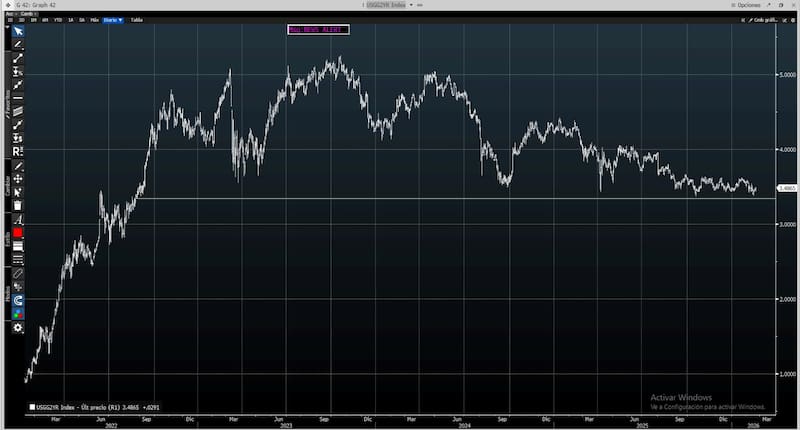 Las tasas de los bonos americanos se ubican cerca de sus minimos del 2025. La tasa a 10 años cotiza en 4,07% y la tasa a 2 años en 3,47%, siendo estos niveles similares a los que operaba en 2022.
