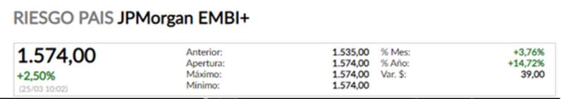 En línea con la debilidad de los bonos, el riesgo país vuelve a subir y se vuelve a acercar a los 1600 puntos, operando en 1574 puntos. De esta manera, el índice sube casi 500 puntos básicos (o un 46%) desde el canje de deuda llevado a cabo en septiembre pasado.