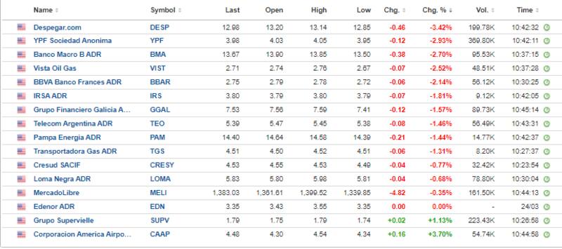 Dada la volatilidad en Wall Street y la baja de los bonos, los ADR acompañan la tendencia a la baja. Las acciones de Despegar lideran los retrocesos cayendo 3,4%, seguida por YPF que cae 2,93%, Banco Macro (2,7%), Vista Oil y BBVA Argentina que pierden 2,7% y 2,5% respectivamente.