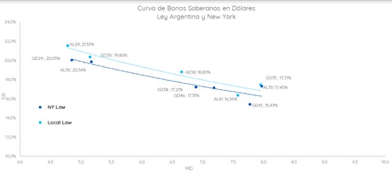 Los bonos globales más cortos rinden 19,75% y los más largos operan con tasas por encima del 15%. La curva de ley local opera con tasas del 21,5% en el tramo más corto y del 17% en el tramo más largo.