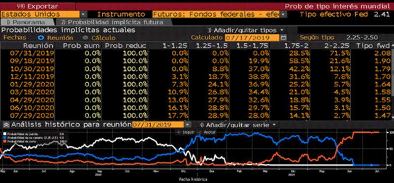 “La Fed prevé un recorte en la tasa de interés de EE.UU. de corto plazo que se encuentra entre 2.25% y 2.5%, ante la expectativa de desaceleración del crecimiento americano. Así, los mercados esperan con una probabilidad del 100% un recorte en la reunión del 31 de julio. Los inversores, están volando hacia el riesgo, y llevando a la apreciación de las monedas de mercados emergentes y a una depreciación del dólar -del orden del 0,7% en los últimos 30 días , dijeron desde la compañía.