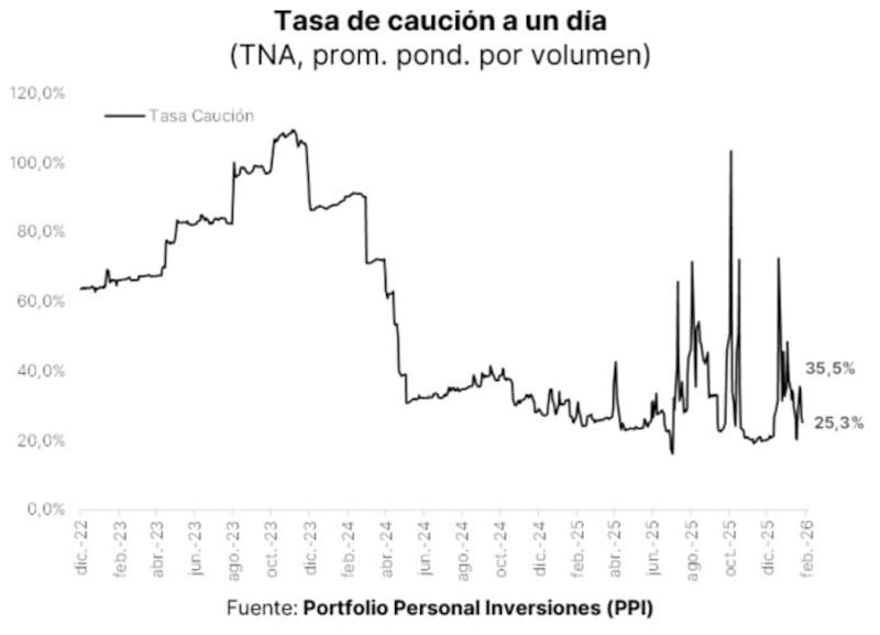 Lo mismo ocurrió con la caución, que supo tener jornadas de extrema volatilidad, aunque en las últimas semanas se mantuvo estable en niveles debajo del 30% (TNA).