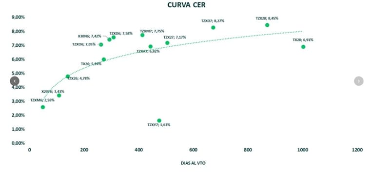 Los CER pasaron de tasas en el extremo más corto desde niveles de 6% al 4,5%, mientras que el tramo medio comprimió desde 7% a 6% y el tramo mas largo se mantuvo inalterado.