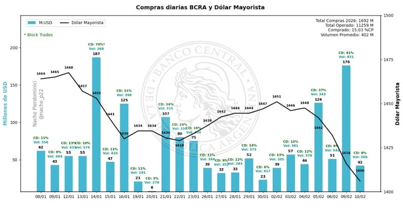 De esta manera, el BCRA ya lleva adquiridos el 15% del total operado en el mercado de cambios en el 2026.