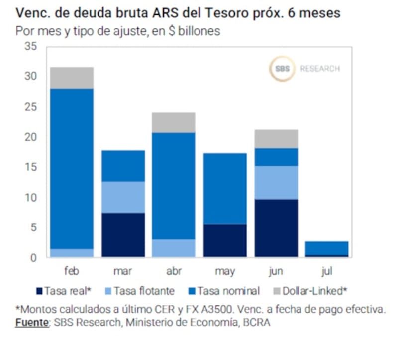 Según remarcaron desde Max Capital, al 5 de febrero tenía $ 3,2 billones y u$s 458 millones, por lo que remarcaron que nuevamente necesitará asegurar un rollover elevado.