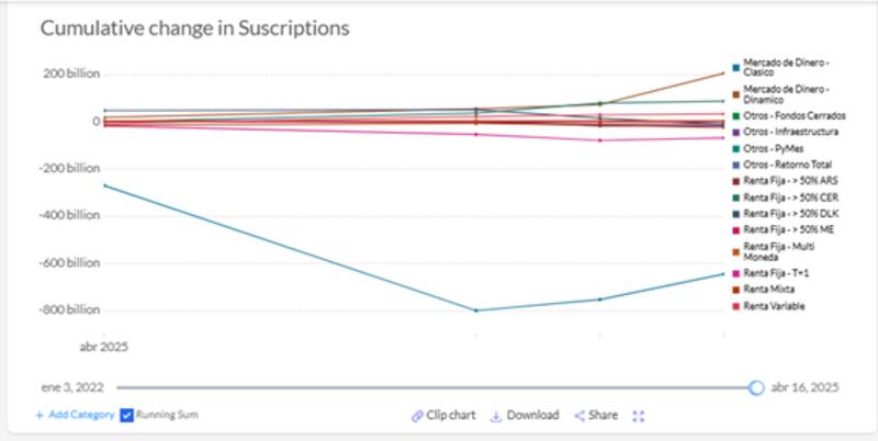 En cambio, los fondos T+1 y dólar linked sufrieron rescates netos por $681.510 millones y $120.060 millones respectivamente.