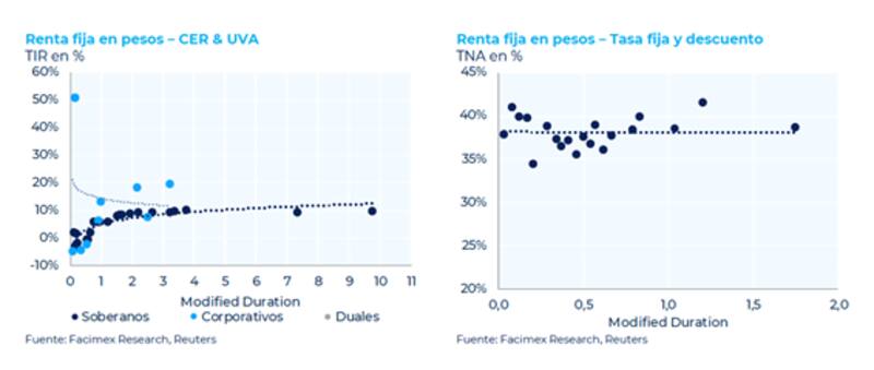 "Si se estabiliza el tipo de cambio dentro de la banda, los bonos CER y pesos a tasa son atractivos. Los títulos CER con duration de 1,5 años y tasa del 8% es muy atractivo. Los bonos de tasa fija en pesos con plazo corto, en torno al 37% también. Armar un portafolio con pesos a corto y CER un poco más largo da una buen tasa y tenes algo de cobertura", indicó.