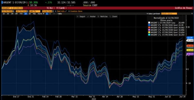 En lo que respecta a los bonos en moneda dura, también están cerrando un muy buen mes. Todos los tramos de la curva argentina operaron con ganancias durante junio.