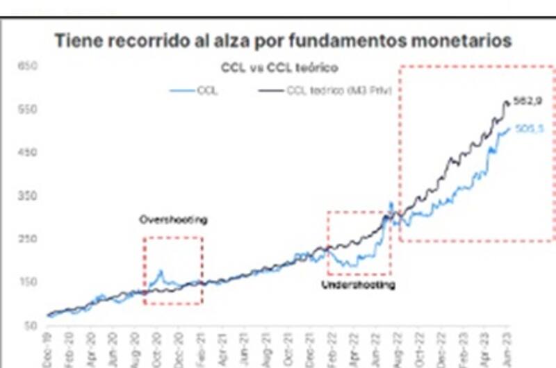 "El CCL teórico, que considera la evolución de la cantidad de dinero en la economía (M3 privado), se ubica en $ 563, lo que indica una brecha del 11,4% con observado. Este valor muestra la foto hasta hoy, pero no la película que está por venir. Habría muchos pesos en camino para financiar el déficit fiscal, así como por operaciones de mercado abierto, adelantos transitorios y un posible dólar soja 4. Así, el dólar CCL teórico se irá ajustando al alza", comentaron.