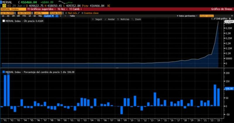 El S&P Merval en pesos subió 21,6% en el último mes, mientras que en el acumulado del año las acciones ganan hasta 106% en moneda local. En lo que respecta al índice en dólares, las acciones ganan 18,4% en junio y 40% en 2023.