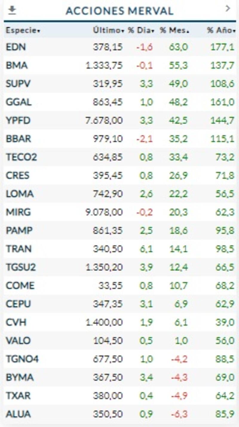 El resto de las acciones operaron en su mayoría con subas de dos dígitos, ganando entre 11% y 33%.