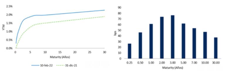 En lo que va del año, la curva soberana norteamericana ha experimentado un fuerte desplazamiento alcista en sus distintos tramos. Los vencimientos más cortos exhibieron un rally en sus rendimientos ante la expectativa de una Reserva Federal que se torna más agresiva en su política monetaria debido a la aceleración inflacionaria y por contar con un mercado laboral cerca del pleno empleo.