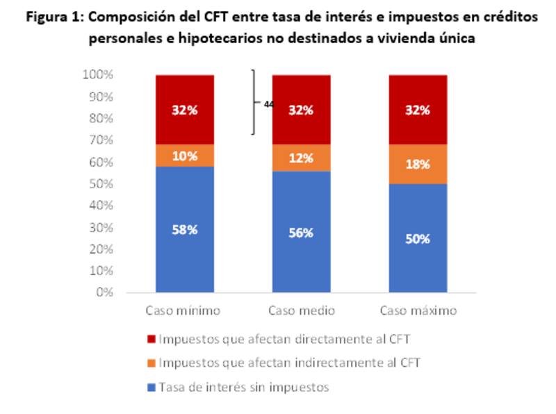 Un informe elaborado por la Fundación Mediterránea señala que los impuestos, entre nacionales, provinciales y municipales, representan en promedio el 44% de lo que se paga al tomar un préstamo, mientas la tasa de interés sin impuestos representa el 56% restante, lo que termina desincentivando la toma de créditos.
