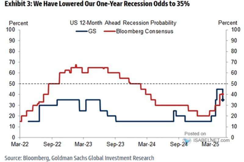 Por ejemplo, Goldman Sachs redujo su riesgo de recesión en Estados Unidos a 12 meses del 45% al 35% después de que Estados Unidos y China acordaran una pausa temporal en los aranceles.